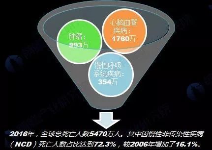 根據(jù)2016全球疾病負(fù)擔(dān)研究(Global Burdenof Disease Study 2016,GBD)公布的數(shù)據(jù)顯示,2016年全球總死亡人數(shù)為5470萬人,其中死于慢性非傳染性疾病(NCD)人數(shù)占比達(dá)到72.3%,總?cè)藬?shù)為4004萬人。2016年慢性非傳染性疾病(NCD)死亡人數(shù)較2006年增加了16.1%。    2016年,造成最多死亡人數(shù)的三類死因?yàn)椋盒哪X血管疾病-1760萬;腫瘤-893萬;慢性呼吸系統(tǒng)疾病-354萬。