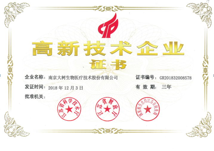 近日,我公司獲得由江蘇省科學(xué)技術(shù)廳、江蘇省財政廳、國家稅務(wù)總局江蘇省稅務(wù)局聯(lián)合頒發(fā)的“高新技術(shù)企業(yè)”證書,由此正式邁入國家高新技術(shù)企業(yè)行列。南京大樹生物醫(yī)療技術(shù)股份有限公司是一家集研發(fā)、生產(chǎn)、銷售為一體的專業(yè)體外診斷試劑醫(yī)療器械公司,公司秉承“質(zhì)量為先、信譽(yù)為重、以人為本、精益求精”的質(zhì)量方針,通過我們的專業(yè)技能和不懈努力竭力為廣大客戶提供創(chuàng)新優(yōu)質(zhì)的產(chǎn)品及完善的售后服務(wù)!